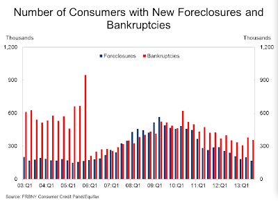 Despite the improvement in the economy, about 355,000 consumers had a bankruptcy notation added to their credit reports, roughly the same number as the year before. Here is a graph showing the number of consumers with new foreclosures (in blue) and new bankruptcies (in red):