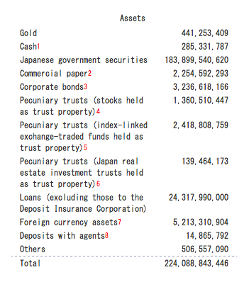 Let's look at an example. A relatively large purchaser of equities is the Bank of Japan, holder of the world's second largest reserves. On November 30, 2013, the BoJ held the following assets:
