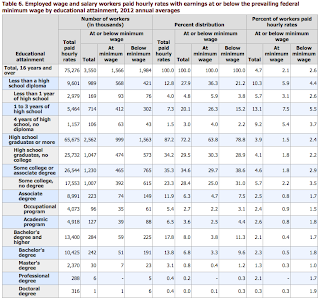 A substantial 13.1 percent of workers with only one to three years of high school earn at or below the minimum wage level followed by 9.2 percent of workers with four years of high school and no diploma. As educational levels rise, there are fewer workers earning at or below the minimum wage level; by the time a worker gets an occupational college degree, only 2.4 percent are at or below minimum wage and only 1.3 percent of workers with a Master's degree are at or below minimum wage.