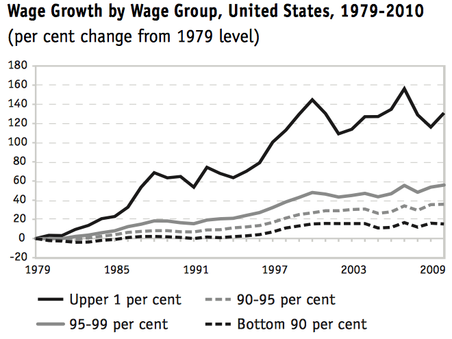The share of all wages paid to the top one percent of earners has nearly doubled from 1973 to 2010; in 1973, the top earners received 6.8 percent of all wages paid. By 2010, this had increased to 12.9 percent of all wages paid. In fact, the top 0.1 percent of earners received 4.7 percent of all wages paid in 2010, up from 1.5 percent in 1979. This is in sharp contrast to the earnings of the bottom 90 percent of earners who saw their wages in 2010 being only 115 percent of their wages way back in 1979!