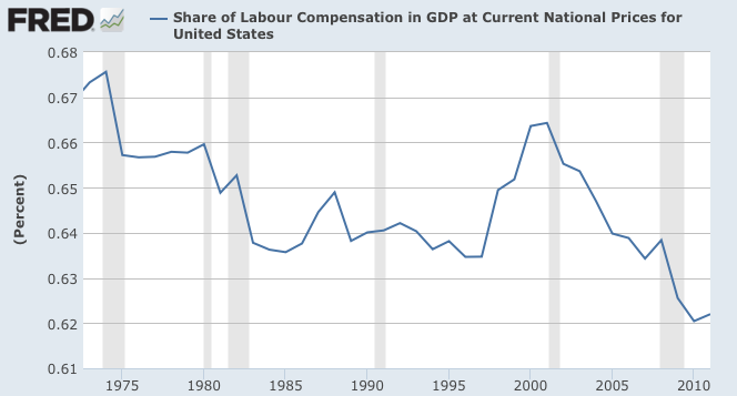 Between 1974 and 2011, labour's share of GDP fell from 67.7 percent to 62.2 percent, the lowest level on record looking back to 1950. Note that during the 1980s and early 1990s, labour's share was pretty consistent, rising between 1997 and 2001 when it hit 66.4 percent. From there, it began its downhill slide to 62.2 percent as noted above.