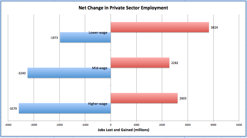 Here's the result in graphic form with jobs lost in blue and jobs gained in red for each of the wage levels: