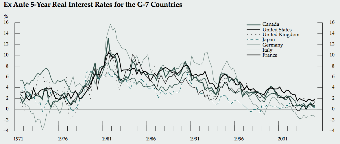 In case you should think that this is an issue facing just American savers, here is a chart from the Bank of Canada showing five year real (i.e. corrected for inflation) interest rates for several key OECD nations between 1971 and 2005: