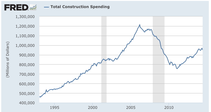 We often think of government being able to stimulate the economy out of a recession. Here is a graph showing total public spending on construction:
