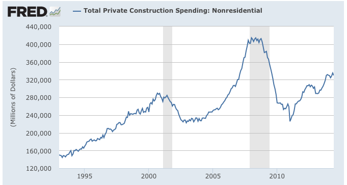Public spending on construction has fallen far less than the other three components and in June 2014 was 18.7 percent below its peak of $325.5 billion at $264.7 billion. Unlike the other components, however, it has declined more or less continuously since the end of the Great Recession.