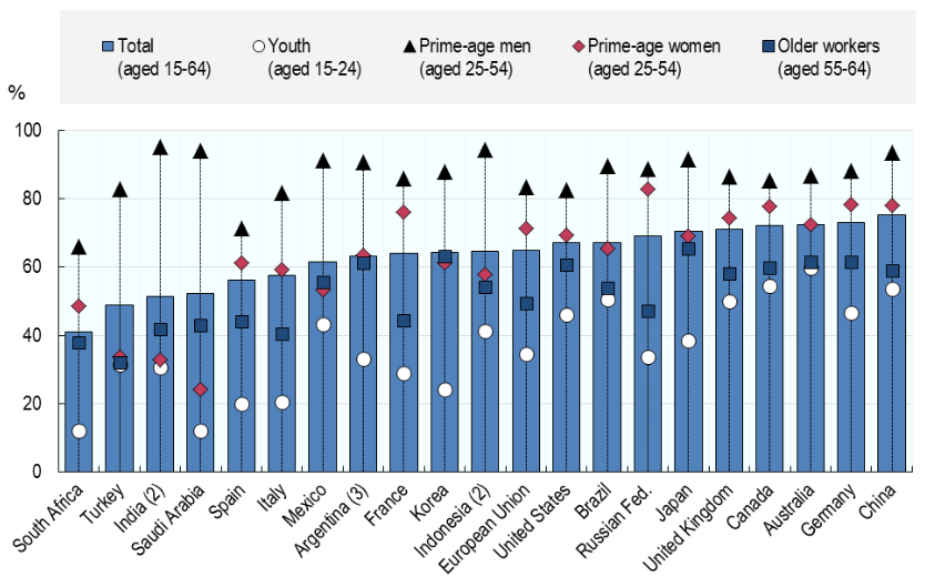 The total share of the population that has found work varies widely across the G20, from 42 percent in South Africa to 75 percent in China with the United States coming in at 67 percent and Canada coming in at 72 percent.