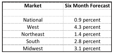 Here is a chart showing Clear Capital's six month house price appreciation forecast by region: