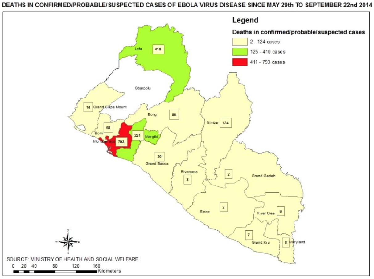 In this posting, I'm going to focus on the impact of the Ebola epidemic on Liberia, the nation that has suffered the most deaths thus far. Here is a map showing the latest death count, current to September 22, 2014, the latest date that the Liberian Ministry of Health and Social Welfare has provided us with mapped data: