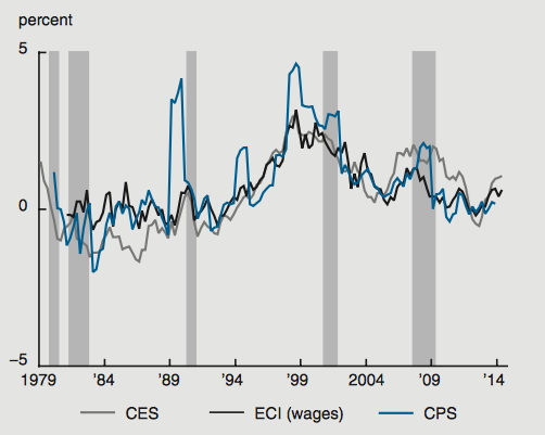 The authors calculate that if labor market conditions were the same as what they were in the period between 2005 and 2007, average real wage growth would have been one-half to one percentage point higher in June 2014 than it was.