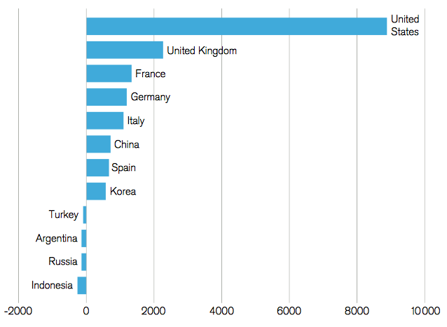 Let's look at the United States data in more detail. For the year 2013, $12.9 trillion was added to the stock of personal wealth. This exceeds the gain in any other 12-month period since Credit-Suisse began tracking personal wealth in 2000. This amount exceeds the $12.3 trillion that was lost during the financial crisis and pushes the average wealth 19 percent above the pre-crisis peak seen back in 2006 and 50 percent above the Great Recession low in 2008. In fact, since 2008, more than $31.5 trillion has been added to American household wealth, an amount that is equivalent to nearly two years of GDP. It is also interesting to note that the year-over-year gain in total wealth in the United States was by far the highest among the nations sampled as shown on this graph: