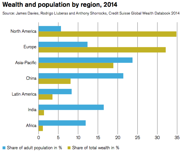 North America has only 6 percent of the world's adult population but has 34.7 percent of the world's total wealth, the highest among the regions. Europe has a greater population (12 percent of the world's total) and a wealth share that is slightly lower at 32.4 percent. Africa has around the same share of the world's population but has around 1 percent of the world's total wealth, coming in last place.