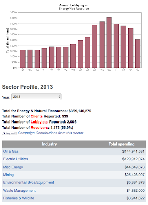 According to Open Secrets, in 2013, the energy and natural resources sector spent $359.1 million lobbying in Washington as shown on this graphic: