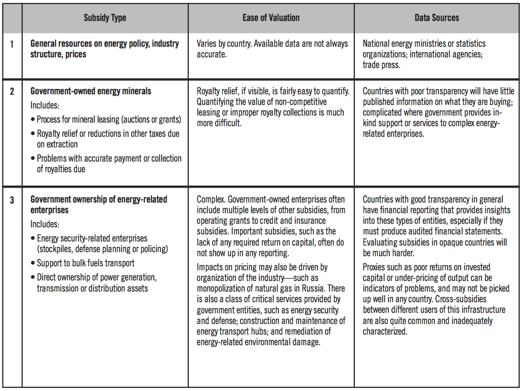 In their Untold Billions study, the International Institute for Sustainable Development's Global Subsidies Initiative looked at the types of subsidies available to the fossil-fuel industry and found that these subsidies fell into eleven categories:
