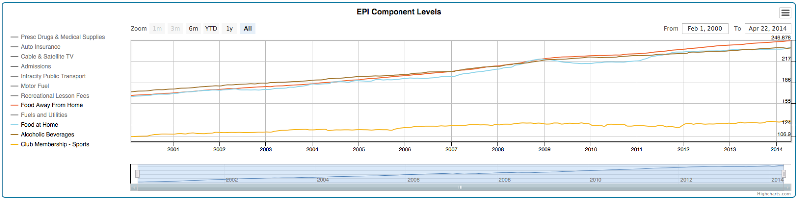 As shown on this graph, the lowest price increases over the decade and a half have been seen in food at home which has only increased by 42 percent, food away from home which has increased by 48 percent, alcoholic beverages which have increased by 37 percent and club memberships which have increased by 21 percent as shown on this graph: