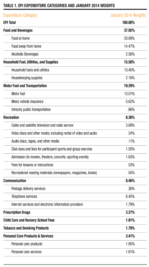 Here is a chart showing the expenditure categories and weights used in calculating the EPI: