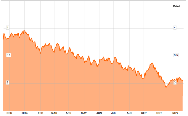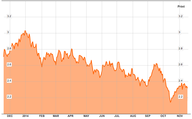 Yield on 10 year Treasuries are currently between 2.3 and 2.4 percent, down from a high of 3 percent back in January 2014. Yields are just above their year-long closing low of 2.1 percent in mid-October 2014 around the time that the Fed announced that its purchase of Treasuries was coming to an end.
