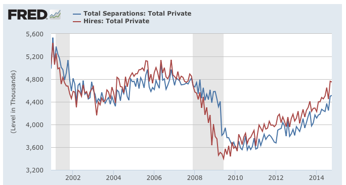 Secondly, as I noted above, the rate of separations and hires have changed during the post-Great Recession period as you can see on this graph: