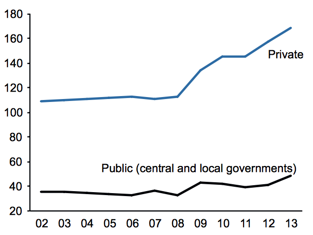 Here is a graphic that shows the breakdown of private sector and public sector debt: