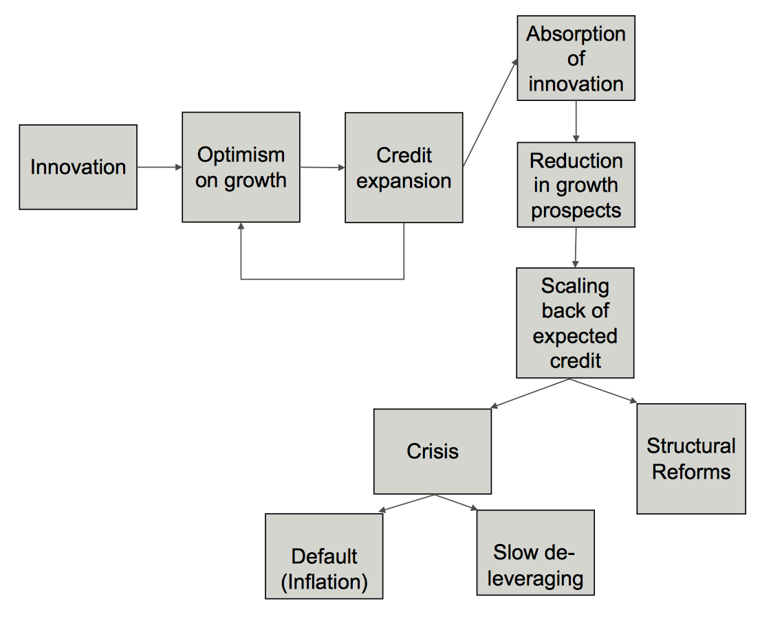 Each box in the diagram denotes a specific episode in the innovation cycle.  The cycle begins with a technological, financial or legal innovation (i.e. the expansion of railroads, the advent of radio and television, the invention of the computer, the unlocking of equity in homes, joining the World Trade Organization (i.e. China) etcetera).  These innovations result in optimism among governments, consumers and corporations which leads to an expansion of the amount of debt that each group is willing to take on since people, corporate leaders and governments feel that they are able to pull future income forward through borrowing to consume today because they are confident that they will be able to repay their debt.  Unfortunately, as time passes, the absorption of new technology slows as returns diminish, eventually resulting in slowing growth prospects.  At that time, the ability of the government, consumer or corporation to service its debt declines and there is a scaling back of the amount of credit that can be sustained.  The biggest problems occur when the reduction in debt capacity ends up being lower than current debt levels.  This means that the excessive optimism that resulted from the innovation has caused over-borrowing and that the capacity to repay the debt is questionable and results in either a debt crisis which could occur through either a debt default or slow deleveraging or complete structural reforms.  This cycle has been repeated throughout history; the post-Second World War Japanese economy is a prime example.  Ireland in the first decade of the twenty-first century is another example of the result of over-exuberance in the technology sector.    The authors also note that China could be following the path of its developed economy counterparts.