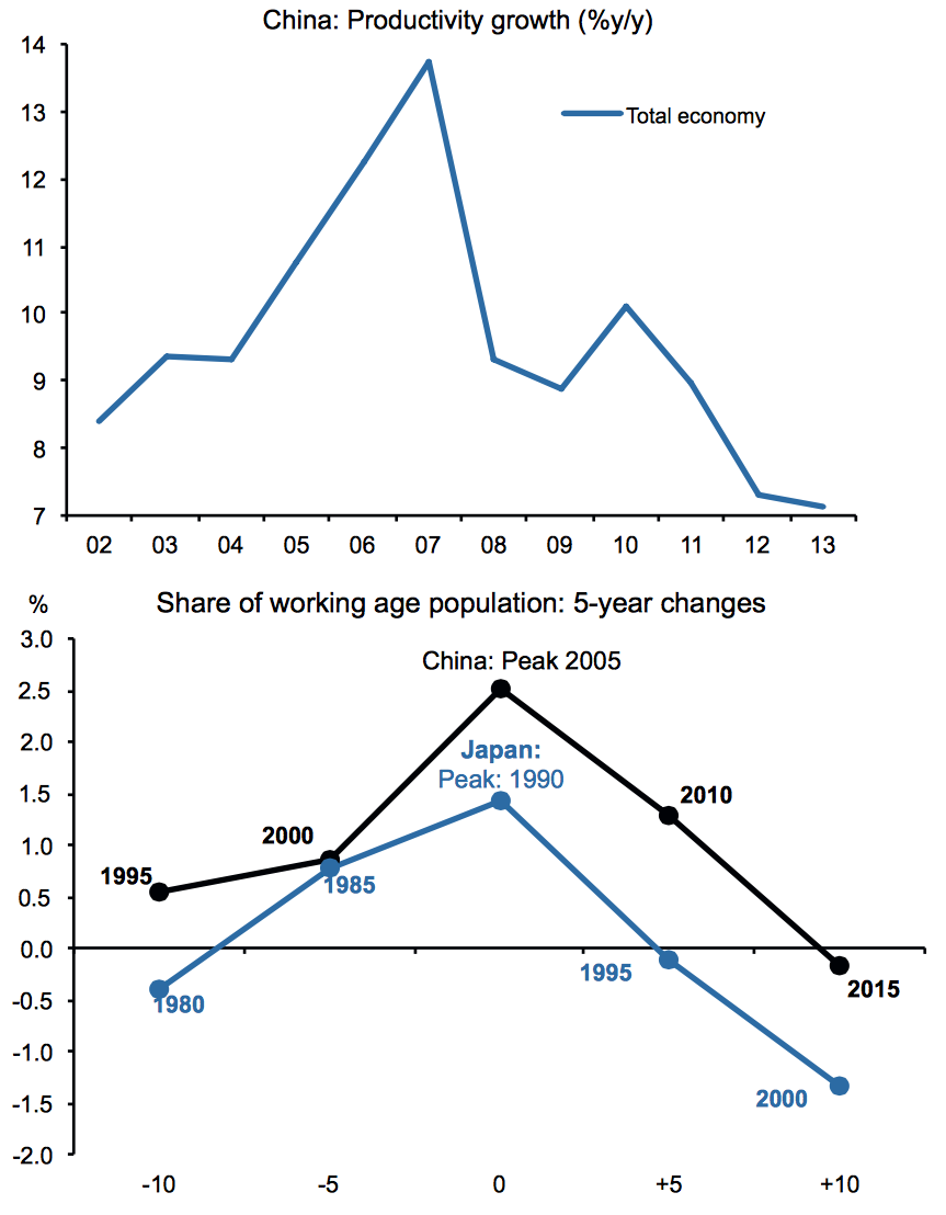 The strong growth in the first half of the first decade of the 21st century is consistent with both demographic and productivity growth.  During this part of the cycle, debt levels in the Chinese economy were relatively stable.  When growth started to fade because of dropping demand for its exports during the 2008 recession, China was also facing two additional problems; a drop in the productivity boost that had been created by China's accession to the WTO as shown on these graphics and a changing demography: