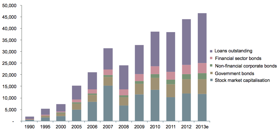 This is almost double the rate of debt accumulation that both the United States and the United Kingdom experienced over the six years before the crisis of 2008.  The fast pace of China's debt accumulation means that the overall indebtedness of China's economy is now 220 percent of GDP, double the average of other emerging economies.