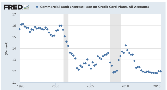 According to CardHub, consumers ended up 2014 with a $57.1 billion net gain in credit card debt, the highest annual increase since the Great Recession. The average household's credit card balance was nearly $7200 at the end of 2014, very close to the tipping point of $8300, the danger level defined by CardHub as being unsustainable. One thing that is lulling consumers into higher levels of credit card debt is low interest rates. As shown on this graph, at 11.8 percent, the interest rate on consumer credit cards is just above the lowest levels that have been seen over the past two decades: