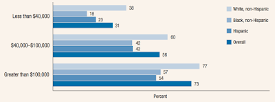 Note that a majority of households of all ethnic and racial groups making less than $40,000 annually have not saved $400 for emergency expenses. Overall, just 53 percent of respondents said that they would be able to handle an emergency expense of $400 fairly easily with 47 percent stating that an unexpected expense of this type would prove to be problematic. Overall, only 45 percent of respondents indicated that they have set aside a rainy day fund that would cover three months of expenses.