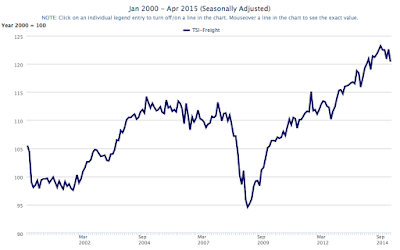 It's quite clear that since November 2014, the freight TSI has plateaued and is showing signs of declining. At the very least, its growth trend from the end of the Great Recession in June 2009 has ended.