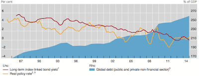 The authors note that the current very low interest rates that have prevailed for such a lengthy period of time are not "equilibrium rates" that are conducive to sustainable global expansion, rather, the have contributed to the current global economic weakness by fuelling financial booms and busts. The result is too much debt, too little growth and low interest rates that "beget lower rates". This is quite apparent in this graphic that shows what has happened to the global public and private non-financial sector debt levels as a percentage of GDP as shown on this graphic: