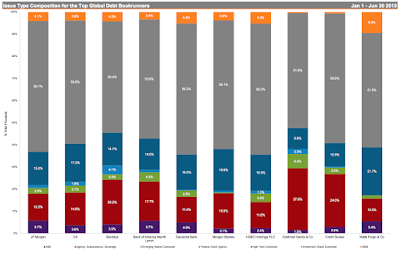 The global volume of high yield debt reached $241.6 billion during the first half of 2015, down 12 percent from the first half of 2014. This is the slowest first half for global high yield debt in two years with Q2 2015 high yield debt issuance dropping by 27 percent from the same quarter in 2014 when a record $160.3 billion worth of junk bonds were issued. A total of $176.8 billion in high yield debt was issued in the United States and globally, $251.5 billion in high yield debt was issued. Of the new global high yield debt issued, JP Morgan was responsible for 11.1 percent of the market share, the highest among all banks. High yield corporate debt totalled 15 percent of the total global debt issued by JP Morgan in the second quarter of 2015 and, for the world's other major players, we can see how important junk bonds (in dark blue) are to their underwriting fees as shown on this graphic: