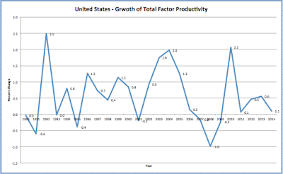 Fortunately, the Conference Board supplies us with data showing the growth rate of TFP. Here is a graph showing what has happened to the annual growth of TFP for the United States from 1990 to 2014: