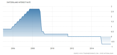 Let's look at what will likely happen in a negative interest rate environment. We need look no further than the example of Switzerland. Here is a graphic showing what has happened to Switzerland's official interest rate over the past ten years as set by the Swiss National Bank: