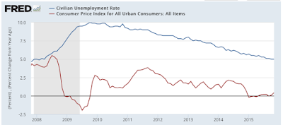 As we've noted, since late 2010, the unemployment rate has fallen steadily yet, inflation has remained tame as shown on this graph: