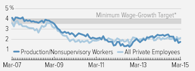 Productivity growth over the cycle between 2001 and 2007 averaged 2.1 percent and over the four cycles between 1973 and 2007, it averaged 1.5 percent. The author feels that range of 1.5 to 2.0 percent is reasonable. Therefore, if we sum changes in productivity at 1.5 percent to 2.0 percent and accompany it with inflation at 2.0 percent (the Federal Reserve's target rate), then hourly compensation growth of between 3.5 and 4.0 percent should not cause a problem. That said, as shown on this graph, the year-over-year change in nominal average hourly earnings of American workers since 2007 has been well below the minimum wage-growth target (shaded grey):