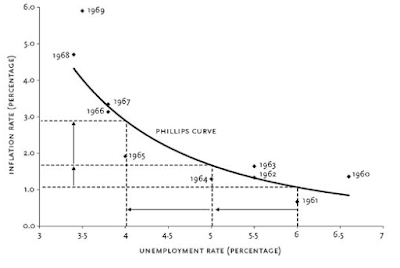 Economists like to use the Phillips curve which plots the percentage change in inflation (or nominal wages since the two are closely connected to each other) against the level of unemployment which looks like this for the 1960s: