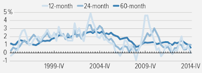 Obviously, changes in worker compensation are closely connected to the growth rate of productivity. Here is a graph showing the total growth in net economy-wide average annual changes in productivity over 12, 24 and 60 month-long cycles between 1995 and 2014: