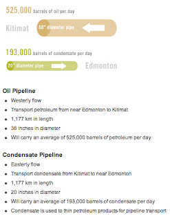 For those of you who aren’t aware, the NGP is a twinned pipeline being being proposed by Enbridge to move 525,000 barrels of diluted bitumen sourced from the oil sands projects in Northern Alberta to Kitimat, British Columbia and 193,000 barrels of condensate per day from Kitimat to Edmonton where it is used as a dilutant for the lower gravity synthetic crude. This pipeline will function as competition for the proposed TransCanada Keystone XL pipeline to the United States Gulf Coast. Kitimat, through their connection to open water via the Douglas Channel, is currently handling tankers carrying petrochemicals and will likely serve as a launching point for diluted bitumen as it is shipped to China.