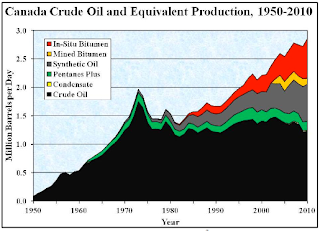 Canada’s conventional oil production peaked in 1973 at roughly 2 million BOPD. Current growth in oil production is sourced strictly from both in situ and oil sands mining, accounting for 51 percent of Canada’s 2.86 million BOPD in 2010 as shown on this graph: