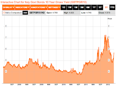 Over the past year, many nations, particularly those in Europe, have seen the yields on their sovereign bonds skyrocket to levels not seen for decades in some cases. Since bond yields rise as bond prices fall, these higher yields are a result of dropping prices for bonds as demand for riskier national debt has decreased. Here is a prime example showing what has happened to the yield for Italy’s debt, noting that it is well above its five year average:
