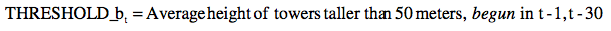 "As a measure of US tower-building activity, I examine the number of towers exceeding a threshold defined by the trailing average height of large buildings. Since the height of large towers is trending upward over time, this appears superior to the use of a fixed threshold such as 100 meters. Specifically, I define the threshold to be the average height of buildings of over 50 meters that were built in the thirty-year interval before the year in question. The choice of thirty years is motivated by the observation that building activity can follow relatively long cycles. For example, in the 20 years from 1933 to 1952, only 76 towers of over 50 meters were built, and these had an average height of 80.1 meters. This compares to an average height of 88.9 meters for the 473 towers whose construction began during the 1923-1932 period. Using a trailing average of thirty years makes the threshold less dependent on general cycles in building activity, and thus better suited to identifying buildings that would be considered tall."