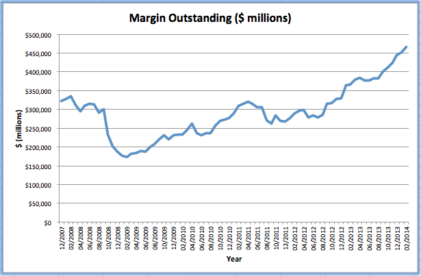 Here is a chart showing the end of month margin debt (in millions of dollars), free credit cash accounts and credit balances in margin accounts for all of 2013 and the first two months of 2014: