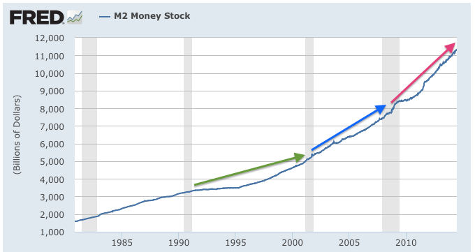 The first thing that you should notice of the graph above is the subtle steepening of the curve between 2008 and the present compared to the period between 2000 and 2008 and 1990 to 2000 as highlighted with the green, blue and red arrows. After each recession since 1991, the Federal Reserve has ramped up the growth in the money supply rather significantly.