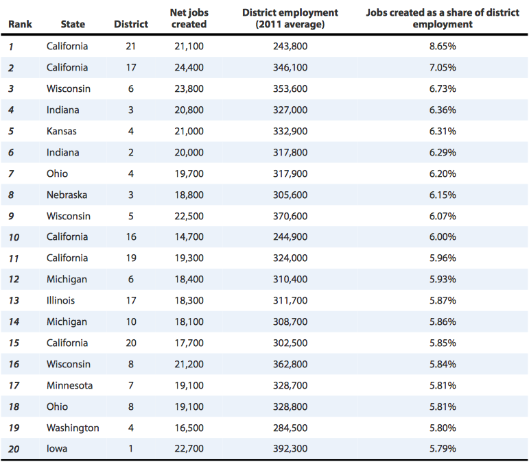 Here is a chart showing the 20 Congressional Districts that would benefit the most from the new net jobs created by ending currency manipulation in the high impact scenario: