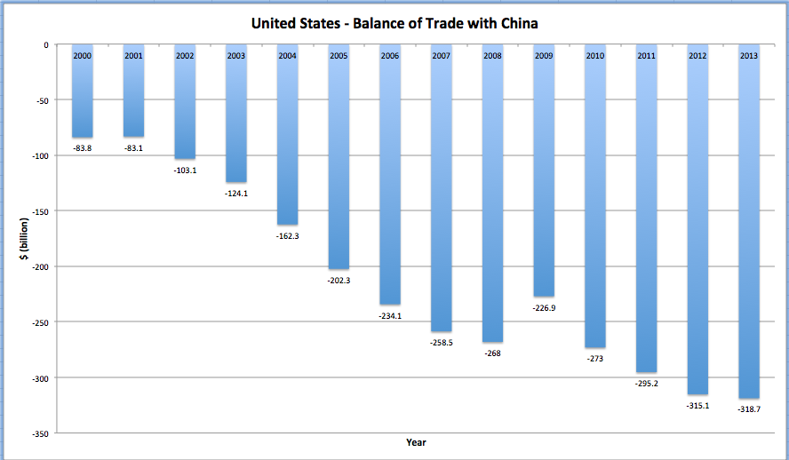 The negative balance of trade with China rose from $83.8 billion in 2000 to $268 billion by 2008, an increase of 220 percent. While the trade deficit with China declined slightly in 2009, it began to rise again in 2010 and was $318.7 billion in 2013.