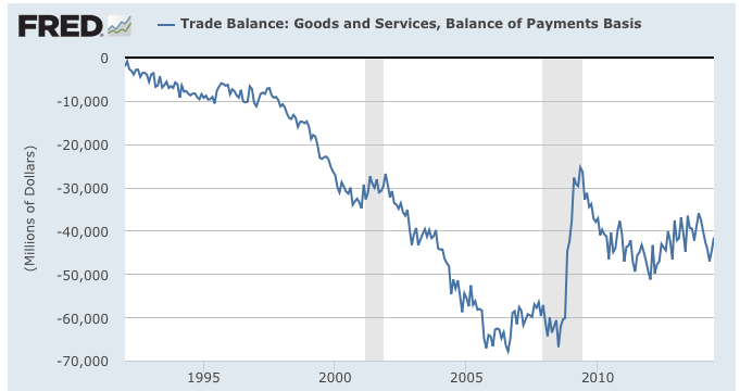 USA: Oye! Times readers Get FREE $30 to spend on Amazon, Walmart…Since the United States trade balance turned negative in the early 1990s, the situation has improved very little, except during the period since the middle of the Great Recession as shown here: