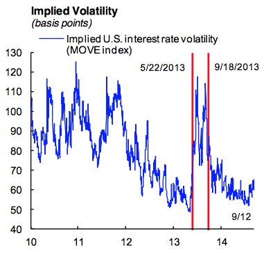 Note the increase in volatility between May 22, 2013 and August 18, 2013? That's when this happened to long-term interest rates as the bond market got ahead of the Fed on when tapering was going to take place:
