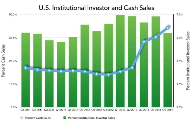 They note that in one community (East Palo Alto), almost half of rental housing stock is controlled by a single company. As well, they note that the preference for cash deals has locked out many potential owners with cash deals making up 42.7 percent on total home sales in the first quarter of 2014 as shown on this graph: