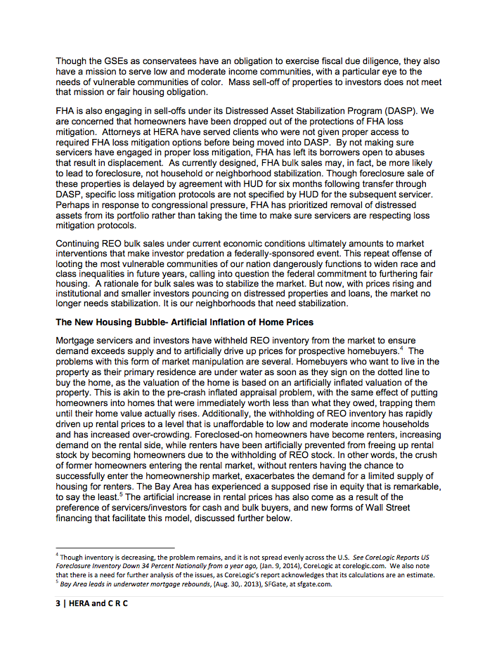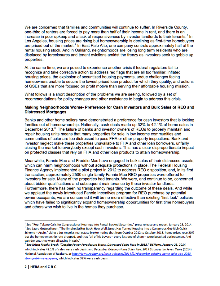 "This letter is sent on behalf of the undersigned organizations concerning a serious and still growing problem – the creation of another housing bubble, the displacement of tenant and homeowner households, and the destabilization of neighborhoods as a result of failed and negligent federal policies. Such policies and inaction have enabled Wall Street and other cash investors to outbid first time homebuyers, displace tenants, and alter the fabric of local communities."