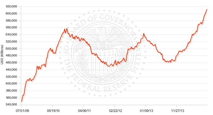This graph shows us the total Treasury holdings of the American commercial banking system on October 15th, 2014. Right now, America's commercial banks are holding $605.8 billion in Treasuries, down slightly from the previous week's record of $612.5 billion. This, despite the fact that many of nation's market sages are predicting a rise in interest rates that will push down the value of fixed income assets.