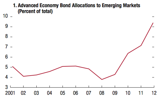 Not only is there a problem with debt issued by American corporations, mutual fund allocations of emerging market fixed income products grew from 4 percent in 2002 to 10 percent in 2012 with most of that going to China. Here is a graph showing how bond allocations have moved to emerging markets over the years since the end of the Great Recession: